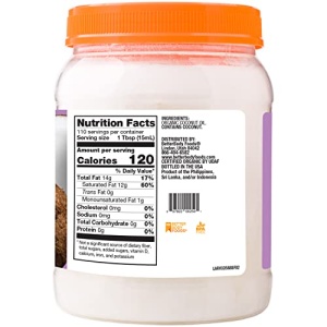 Details: Meet the oil that does it all. BetterBody Foods Virgin Organic Coconut Oil comes from fresh coconut meat and is one of the best oils in the world. We never use chemicals during extraction in order to provide you with the purest, most natural virgin coconut oil available. It is delicious, and works wonders in medium-heat cooking (up to 350 DegreeF). This makes it perfectly suitable for stir-fry’s, rice, scrambled eggs, and more. It takes over for butter or margarine to add a light coconut flavor and aroma to any recipe you add it to. But that’s not all it has in store. It’s got Medium Chain Triglycerides (MCTs)—60% MCTs, to be exact. These MCTs help naturally boost your energy. No wonder we’re nuts over coconut oil. BetterBody Foods makes our Virgin Coconut Oil by pressing oil out of fresh coconut meat, or non-copra. Chemicals and high-heat are not used in refining the oil. It has a very stable shelf life. Virgin coconut oil is naturally solid due to the molecular structure of fatty acids and has a melting point of approximately 76˚F (24˚C). Our Virgin Organic Coconut Oil is pure and unrefined, causing some variances in texture as the oil melts and solidifies. Don’t worry, though—the change in state will not alter the nutrition profile or characteristic coconut qualities in any way. BetterBody Foods recommends storing your coconut oil in a cool environment or in your refrigerator during summer months if you prefer it to remain solid. It can be used as an all-natural moisturizer for your skin and hair and makes a great makeup remover, natural sunscreen and shave oil.