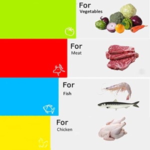 • COLOR CODED: Four assorted colors on the cutting board mats help you to finish different meals. The pictures on each one could be identifying which one to use based on what choice of food being chopped. Each mat has an printed illustration of the item to use them for: meat-fish-vegetables. No guessing what you used these last to cut.