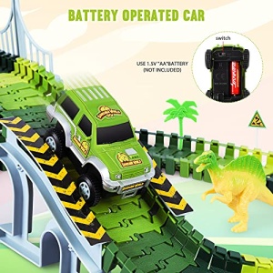 - 2 Race Car Toys and 4 dinosaur molds make the game more interesting more attractive.Learn to cooperate.Exercise hand-eye coordination and color perception.The dinosaur car requires 1x”aa” Battery each (not included)