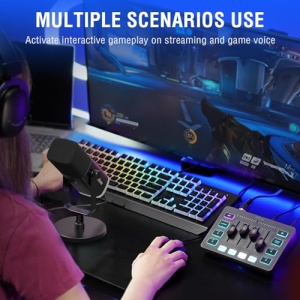 - [Gaming Audio Mixer] Podcast equipment bundle gaming mixer with individual mute control, headphones monitoring and volume fader achieve audio control for a certain output and input channel. You can achieve a faster experience with fewer steps. Multiple entertainment modes allow you to create more fun when team work or streaming. RGB lights on the gaming audio mixer sound effects machine enhance visual atmosphere, further matching the theme aura of gaming streaming.