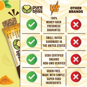 Details: Turmeric Lemon Orange Bar, Organic, Non-GMO, Grain & Gluten Free, Vegan, Ayurvedic Herbs, Cashew Butter 12 Pack: We make grain free paleo friendly superfood real food bars that are fuel for fun. Starting with pure ingredients, we give you energy naturally while spreading some kind juju back to our planet with every bite. We’ve carefully disguised good decisions in deliciousness so you’ll be too busy chowing down to give yourself a pat on the back. Sensational as a vegan snack, fantastic fuel for workout and recovery, and doing what you love, Our goal is to make the purest most delicious fuel for fun with low sugar snack bars, breakfast & cereal bars, gluten free granola bars Try our Pure Bliss Organics super food energy bars you will nourish your body, soul, and grin from ear to ear…Give in to the grin! Our goodness knows no bounds nor borders. Positive food gives you positive energy. Our superfood packed paleo snack nutrient-dense granola & nutrition bars are a great healthy snack before the yoga class, the board meeting, the big game, the workout or just hanging out doing what you love! Professionals, athletes, yogis, or on-the-go families looking for a delicious healthy satisfying snack, look no further! We put joy into every small batch of healthy bars we whip up, and we hope you taste it in every bite. We’re in the business of deliciousness, and we take delight in eating right. Pure Bliss Organics is your plant-based healthy snack alternative for those who want more than average. The nourishment of both the body and the spirit gives you the real sense that you can go out and do something great. This positive energy is flourishing and encouraging you to feel excited and do what you love! Every batch of Pure Bliss Organics paleo friendly grain free energy bars are made here in the United States by a dedicated group of caring creators and delivered to you fresh every single time.